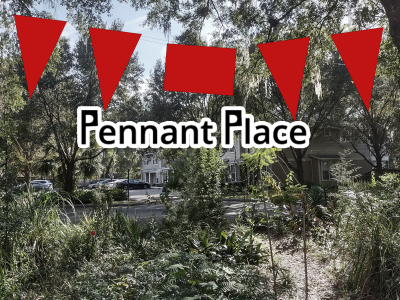 Seeking exhibition proposals from solo artists, collectives, and curators for a new outdoor space, Pennant Place, located in Gainesville, Florida. Work must be able to be hung on a cable about 13 feet (4m) off the ground and must be able to withstand the elements (wind, rain, sunshine, squirrels). Flags, Banners, Clothing, Streamers, Pennants, and Windchimes come to mind, but feel free to surprise us! Total exhibition weight shouldn’t exceed 40 pounds (18kg). There is about 32 feet (9.5m) of cable space for hanging work.