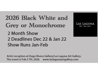 For this exhibition Las Laguna Art Gallery challenges artists to use Black, White or Grey or a combination thereof. All local, national and international artists, professional and amateur are encouraged to apply.